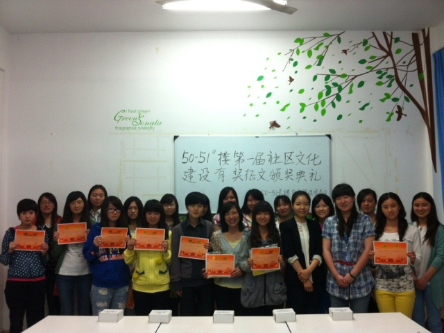 2013年5月15日晚,50-51号楼社区自管会在办公室内举办了“50-51号楼第一届社区文化建设征文”颁奖活动。比赛由自管会主办,面向本社区所有同学征集有关社区文化建设的征文,共有26名同学获奖。出席本次颁奖活动的有社区辅导员陈祯如老师,住楼辅导员马卉老师以及陈洁老师。