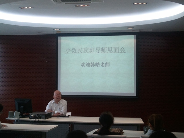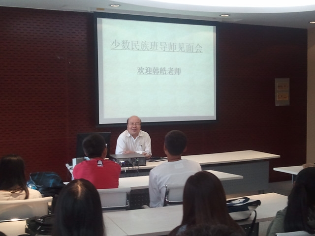 见面会的开始,韩皓老师开门见山的道出了给少数民族同学的大学生涯的建议——不要因为自己是少数民族的学生而感到特殊,要确定大学目标努力朝未来迈进。随后,韩老师不断鼓励少数民族同学要形成积极向上、追求进取的自我要求,并指出以少数民族语言为第一语言的同学要积极学习普通话,早日融入整个集体,多多参加校园活动。见面会的最后,韩皓老师留给同学自己的各种联系方式,解答了他们的疑惑,并且随时欢迎有困难的同学们去找他,整场班导师见面会圆满结束。
