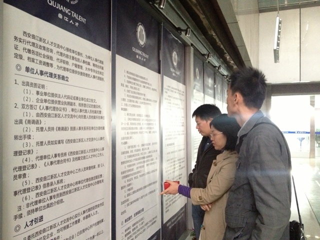 首先,办公室赵先生向我们介绍了人才交流中心的工作职能,并就曲江新区人才交流中心作了介绍,曲江新区人才交流中心经西安市人事局批准成立,隶属于曲江新区管委会。是管委会下属的自收自支的事业单位,主要从事人事代理、培训、职业技能鉴定、大学生免费就业等。接着,赵老师就陕西生源学生回原籍就业等问题进行了咨询,尤其是学生所关心的档案和户口问题,以及回原籍找工作的就业途径。最后在展馆内又浏览了就业政策相关问题的宣传展板。