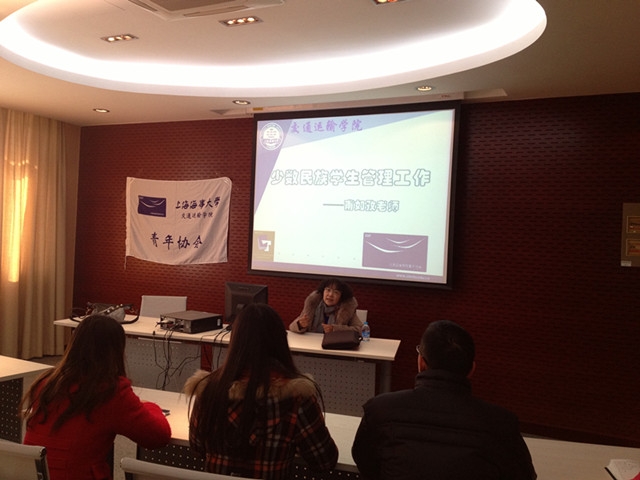 2013年12月31日上午10:00,亚洲成人直播 青年协会邀请甫如孜·霍加老师在交运楼213进行“少数民族学生管理工作”的专题讲座。交运学院党委副书记赵睿老师、团委书记曾令伟老师及各位辅导员参加了此次讲座。