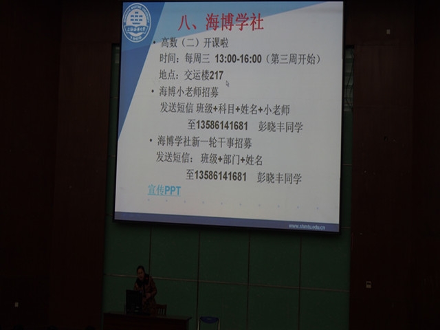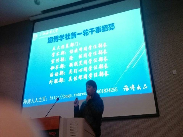 2014年3月2日,在交运学院大一学生的晚点名活动上,海博学社对全院进行了招新宣传。本次活动主要由指导老师朱红红老师组织,海博学社各部门负责协助。