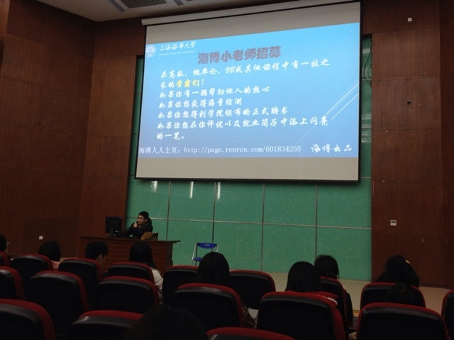 本次活动主要为海博学社干事及小老师招新。海博学社此次共有五个部门进行招新活动,分别为学术部,宣传部,秘书部,活动部,外联部。对于干事而言,可以通过在海博的锻炼获得一些经验,认识更多志同道合的朋友。对于小老师来说,将会获得学院颁发的正式聘书,更能为自己未来评优及就业简历添上闪亮的一笔。海博学社旨在为大家提供一个展示交流的平台,一个发挥个人能力的舞台和一个增强自身各方面素质的机会。通过这次的宣传活动,希望能让更多的同学了解海博学社,并且加入海博学社,一起努力,共同进步。