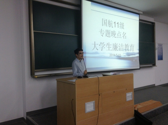 ur2young 在 周一, 05/12/2014 - 16:56 提交 2014年5月11日,国航11级举行了题为“廉以修身 洁以修德”的廉洁教育专题晚点名。 都老师首先列举受贿、失职、渎职等典型案例及名人名言,向广大学生诠释反腐倡廉的丰宣内涵和重要意义,让大学生在耳濡目染后,有所思,有所想,并以传看典型案例小册子加强对大学生的廉洁教育,以史为鉴,警钟长鸣,以活生生的反面典型教育和引导大学生廉洁自律。 本次专题晚点名促进大学生在自我学习中升华思想境界,在廉政文化熏陶中正心明志,在讨论交流中受益启发,实现以学促教的良好效果。