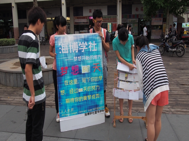 2014年6月18日,亚洲成人直播 海博学社在北广举行了一次对梦想八十八天活动的总结—返还明信片活动。本次活动通过海博学社成员摆摊宣讲的形式完成。