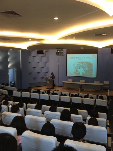 在讲座中,朱红红老师先与同学们进行了互动,让同学们说说由新疆联想到的东西,同学们积极发言,氛围很活跃。接着朱老师向我们简单介绍了新疆,然后以“新疆稳定形势不容乐观”“全面认识新疆工作取得的成绩”、“正确理解新疆工作的总目标”以及“围绕新疆工作的总目标,我们该怎么做”四个方面向我们具体介绍了新疆目前的政治形势以及解决新疆问题的政策。在这其中朱老师还向同学们简要叙述了由新疆恐怖分子引发的各种暴恐案,让同学们正确认识宗教信仰,了解民族团结的重要性。